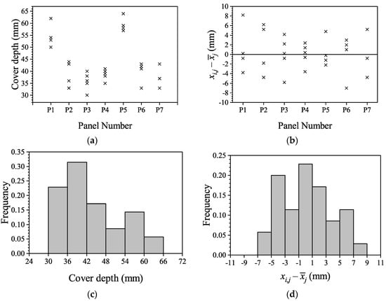 In the inspection, cover depths were measured for seven panels, randomly selected from the 144 identical panels of the wharf, and denoted as P1, P2, …, P7; five measure points on the same precast slab were randomly selected on each panel, and by using the Electromagnetic-induction Method, the position of outer steel bar can be detected, and the cover depth at the measuring point can be measured. The measured values of cover depths on these seven panels are shown as the scatter plots in Figure 4a; the mean value of the cover depth on each panel can be computed, and the differences between the individual measured value with the mean value on the panel can be calculated, shown as the scatter plots in Figure 4b; histograms of them are plotted, as shown in Figure 4c,d. With the method in Section 2, the statistical properties of cover depth can be estimated accordingly.