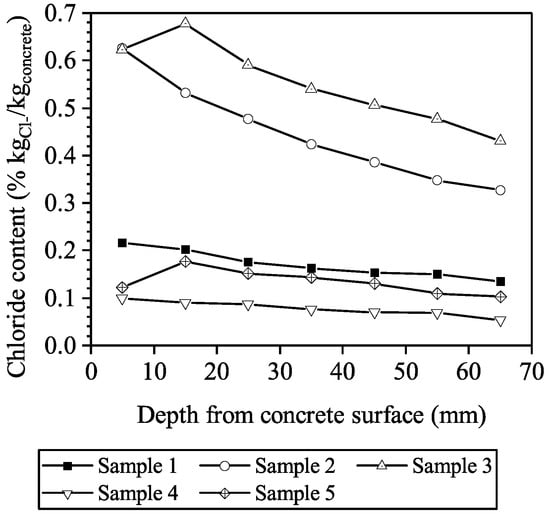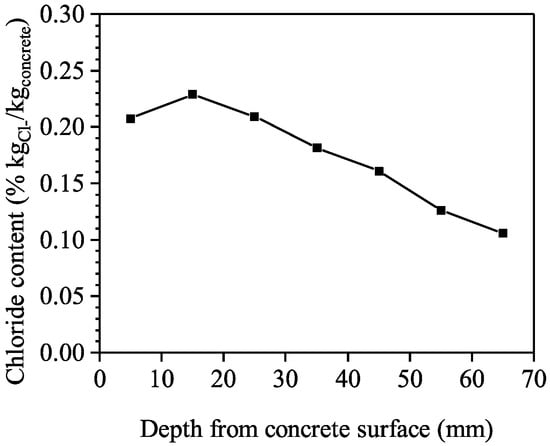 A cylindrical core was extracted on a precast slab, and samples at various depths from the surface were obtained. The chloride content of the sample was measured by the potentiometric titration method. The chloride profile is shown in Figure 5. It can be seen that the peak of the chloride content was measured at a depth of 10~20 mm from the concrete surface; this was reported in existing literature [,], where the phenomena were considered due to the following reasons: (1) the border or wall effect during casting; (2) precipitation of brucite; (3) interface between carbonated and noncarbonated layers; (4) interface between the zones of dampening and continuous wetting and drying etc. According to the fitting based on Fick’s Second Law, the surface chloride concentration is 0.27% in (mass percentage of concrete), and the apparent diffusion coefficient at the age of 23 years is 4.35 in 10−12 m2/s. The results are considered the mean value of and in this study.
