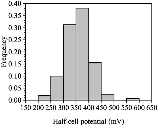 In this testing, the half-cell potentials were measured at 160 measure points, randomly chosen on the panels, and the testing results of the panels are shown in Figure 7; since there are 54% of the testing results higher than 350 mV, and none is lower than 200 mV, the testing suggests that at least half of the steel bars in panels are corroded.