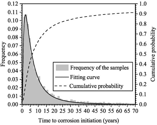 Figure 8 shows the histogram of the simulated time to steel corrosion. In the random-field simulation for an RC panel, if the chloride concentration somewhere on the surface of steel bars reaches the criteria level, , which is the limit concentration level that results in the steel depassivation, the steel bars in the panel are considered as “corrosion initiated”. It can be seen that steel corrosion may initiate very quickly after the construction is completed, and it is most likely to happen around the age of 5 years. The cumulative probability of the time to corrosion initiation is also shown in Figure 8; it can be seen that at the age of 23 years, the probability of corrosion initiated is about 0.8. The results are consistent with the inspection results, which suggested that at the age of 23 years, steel corrosion has been initiated in the majority of the RC panels.