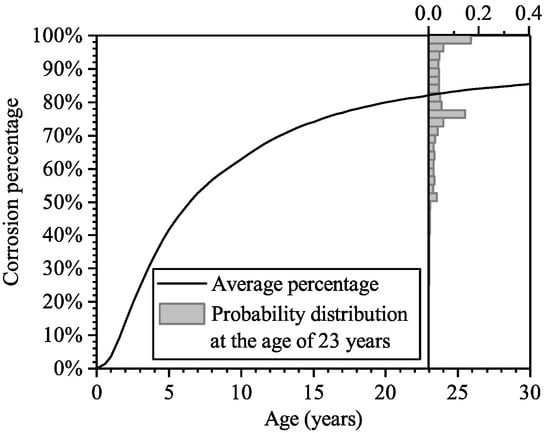 Average corrosion percentage at various ages and the probability distribution of corrosion percentage at the age of 23 years.