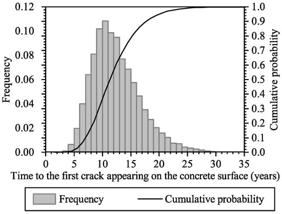 Histogram and cumulative probability of the time to the first crack appearing on the concrete surface.