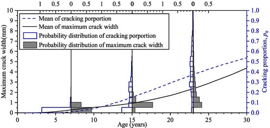 Means of cracking proportion and maximum crack width at various ages and their probability distributions at the age of 7, 15, and 23 years.