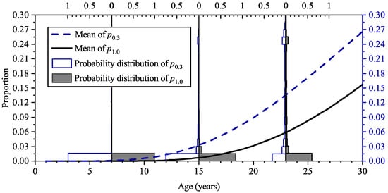 Means of cracking proportion p0.3 and p1.0 at various ages and their probability distributions at the age of 7, 15, and 23 years.