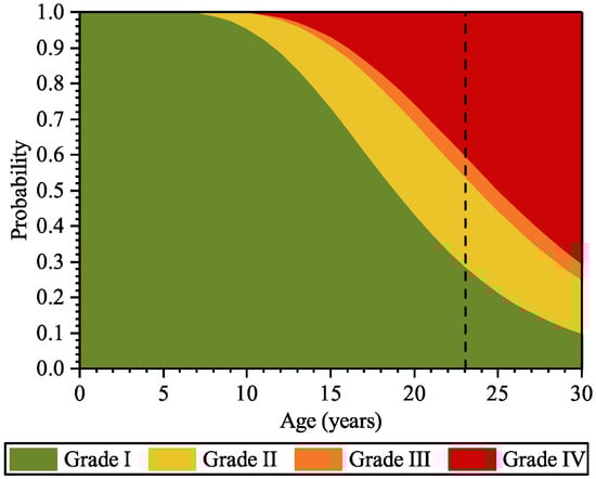 Based on the present system, the damage grading can be simulated. Figure 14 shows the probability of the panels deteriorating to Grade I, Grade II, Grade III, and Grade IV at various ages. It can be seen from the figure that at the age of 23 years, the probabilities of deteriorating to Grade I, Grade II, Grade III, and Grade IV are about 28%, 25%, 6%, and 41%, respectively. A comparison between the simulation results and the inspection results (detailed in Section 4.1) is shown in Table 5. It can be seen that the simulation results coordinate well with the inspection results, which verifies the accuracy of the surface deterioration analysis based on random fields.
