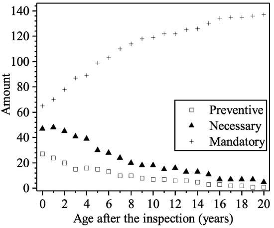 Amounts of panels requiring preventive, necessary, and mandatory maintenance at various ages.