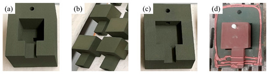 Printed sand molds and sand cores: (a) upper sand mold; (b) sand cores; (c) lower sand mold; (d) assembled parts.
