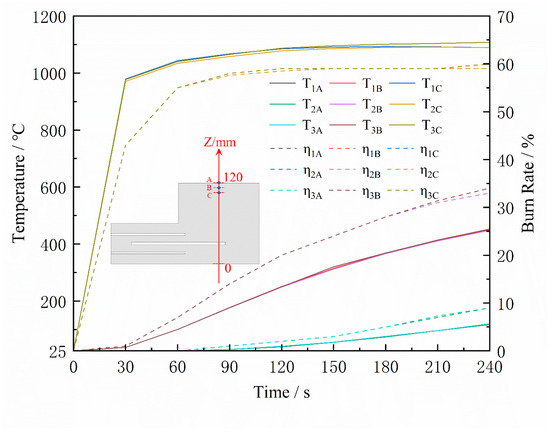 Figure 13 shows the temperature and burnout distribution on the Z-directional center section of the sand core. The maximum burn-off thickness of the sand core was 20 mm after 1 min and 40 mm after 4 min. The temperature of the sand core varied rapidly in the Z-direction, with high surface temperatures and low central temperatures. The heating and burnout of the sand core’s core region were slow.