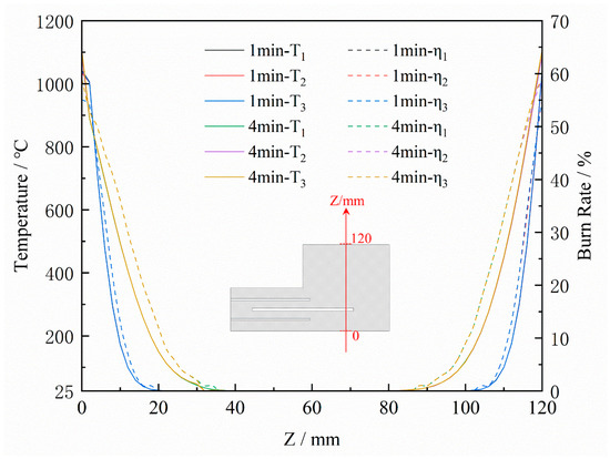 Variation curves of sand core temperature and burnout in the Z-direction of the central section at 1 min and 4 min.
