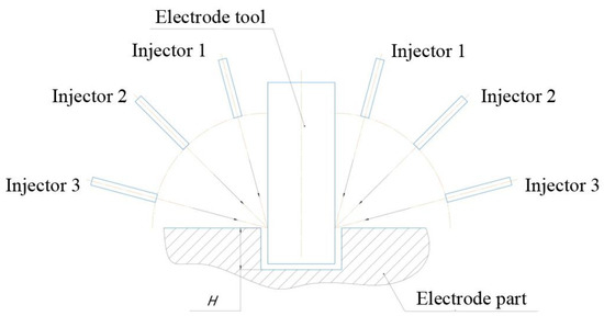 It is shown that the pressure drops of dielectric fluid enhance with an increase in hole depth [18,19,20,21,22,23,24]. This pressure drop is about 15% at 25 mm hole depth, and the accumulation of a higher concentration of eroded material was also observed at the corner of the machined hole [23,24,25,26]. In work [23,24,25], the experiments were carried out using electrical discharge machining with side flushing and multi-aperture flushing to improve the machining performance and surface integrity. The machine parameters were pulse ontime, pulse off-time, current, and electrode rotation. However, these works do not take into account the influence of the angle of inclination of the nozzles relative to the depth on the processing performance and the magnitude of the liquid pressure at the processing site. Figure 1 shows the schematic of side flushing arrangements in the EDM process.