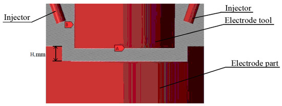 The study of the electrode surfaces at an angle of inclination of 45 degrees was carried out to confirm the theoretical models. Depths of processing are chosen as 2 mm and 15 mm. The scheme of installation of electrodes and flushing nozzles is shown in Figure 16.
