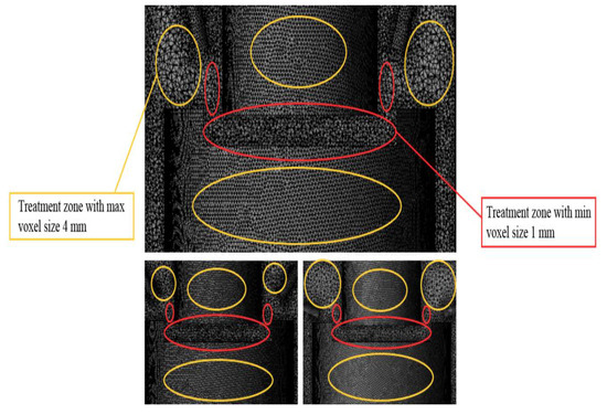 The computational grid is shown in Figure 4. A single voxel’s minimum and maximum values are set to build the grid: min—1 mm, max—5 mm. The authors perform the same condition for other cases. The nozzles will operate at the uniform pressure (0.205 MPa) and angle selected relative to the tool axis.
