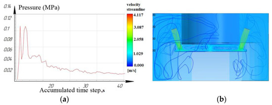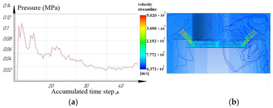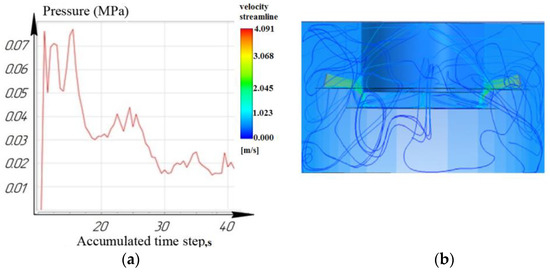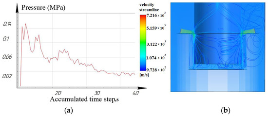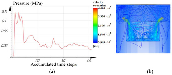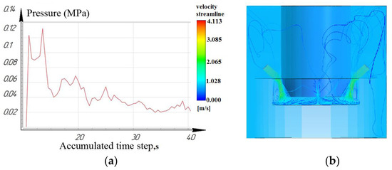 Depth 2 mm, nozzle angle 75°, (a) calculation of the pressure of the working fluid, (b) flow distribution models.