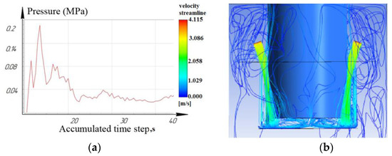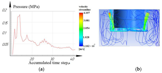 Depth 15 mm, nozzle angle 75°, (a) calculation of the pressure of the working fluid, (b) flow distribution models.
