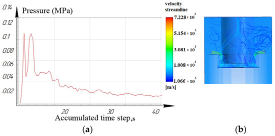 From the results, we can conclude that turbulent movement prevails when the nozzles are located at 45° and 75°. This entails a reduction in dielectric pressure. The pressure value for the nozzle at 75° did not exceed 0.14 MPa (Figure 14), while the nozzle at 15° provided a rational pressure in the treatment zone from 0.1 MPa to 0.2 MPa (Figure 12).