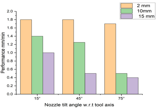 An experimental study was carried out to validate the theoretical modeling of EDM performance on functional materials. Figure 15 depicts the comparison of the performance of the EDM process at various nozzle angles and variable machining depths.
