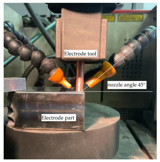 The influence of nozzle inclination angle was manifested during the EDM to a depth of 10 mm and 15 mm. A reduction in the productivity of the EDM was observed due to difficulty in flushing the interelectrode space. Thus, the angle of nozzle inclination should be taken into account for processing holes with a depth of 10 mm or more. For adequate machining, eroded particles/debris must be removed from the gap. During the experimental analysis, it was observed that when the processing holes were to a depth of 15 mm, sludge/debris adhered to the ET surface. Therefore, the closure of the EDM process has also occurred.