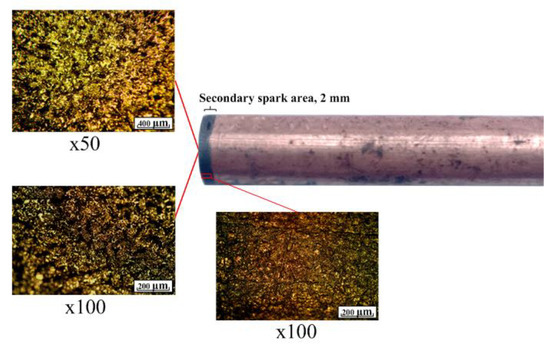 Analysis of Figure 17 shows uniform ET wear. The working area of the electrode changed its roughness during processing. The formed roughness is stable over the entire working part of the electrode. There are no traces of sticking of the material of the workpiece. The slope is flat. The growths are absent. The side zone of the electrode is characterized by a slight change in the surface structure. The surface is uniform. The mathematical model is confirmed. Flushing ensures that the sludge is washed out of the treatment area.