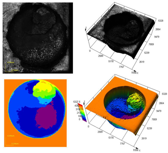 The ET analysis (Figure 18) shows uneven wear on its running surface. Traces of build-up are visible at the end of the ET. The ET surface is not a stable profile. This phenomenon is explained by the results of mathematical modeling. The sludge is concentrated in the center of the interelectrode gap. As a result, there are additional secondary discharges. This results in uneven ET. The lateral part of the ET is characterized by an intensely modified structure over the entire working height. The effect of poor flushing of the interelectrode gap has an effect. The concentration of erosion products contributed to the occurrence of side discharges. A three-dimensional image of the surface of the machined hole to a depth of 2 mm is shown in Figure 19.