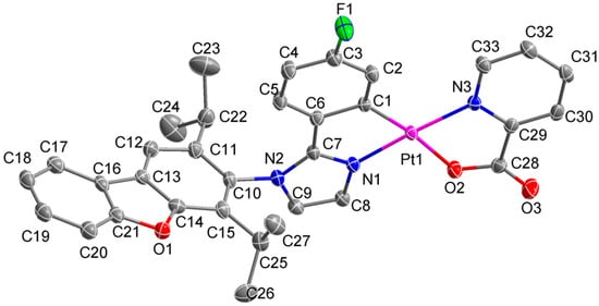 The crystal structure and selected bond lengths (Å)/angles (°) of 2 are shown in Figure 1. Compound 2 had a square planar geometry around the Pt ion with bite angles ranging from 80° to 174°. The Pt–C, Pt–N, and Pt–O bond lengths in Compound 2 were consistent with those of similar Pt(II) compounds in previous studies [23,24].