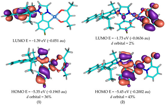 To investigate the effect of the ancillary ligand on oxidation, cyclic voltammetry experiments were conducted on both compounds. A quasi-reversible oxidation at EOX (onset) (vs. FeCp2/FeCp2+) = 0.93 V and 1.03 V was observed for both compounds, as shown in Figure S8. The oxidation potential of 1 was slightly lower than that of 2, which agreed with a previous report on Ir(III) compounds containing either acac or pic ancillary ligands [33]. The C^N chelate ligand formed a stronger bond with the Pt(II) ion in 2 than with that in 1. This plays a key role in increasing the HOMO level because the p-orbitals of the C^N chelate and the d-orbital of Pt(II) are the main contributors to the HOMO level (see Section 3.3). Moreover, the results indicate that acac acts as a weak trans-directing ligand compared to picolinate.