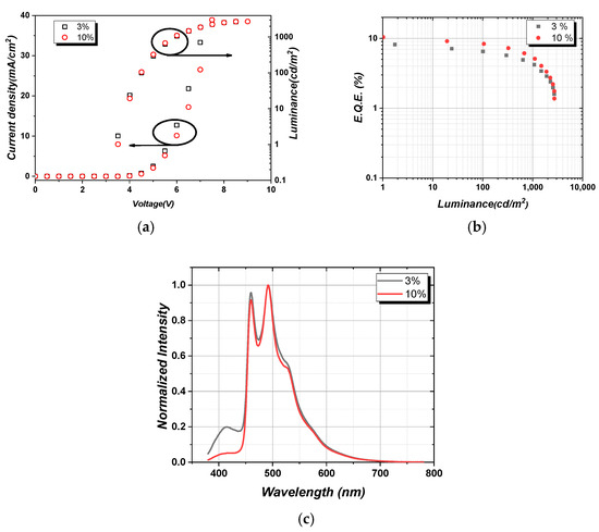 (a) Voltage–Current density-Luminance curves, (b) External quantum efficiency (EQE)-Luminance, and (c) Electroluminescence spectra of 1-based device at 3% and 10% doping levels.