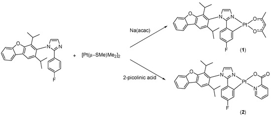 Platinum complexes 1 and 2, incorporating the main dbi ligand, were synthesized according to a previously reported procedure [22], as shown in Scheme 1. Yields of 32–46% were obtained by treating the dbi ligand with [Pt(μ-SMe2)Me2]2 in THF and then adding trifluoromethanesulfonic acid (TfOH). Either Na(acac) or 2-picolinic acid was subsequently added to the reaction mixture. Both complexes were characterized using various spectroscopic methods, and the crystal structure of 2 was determined.