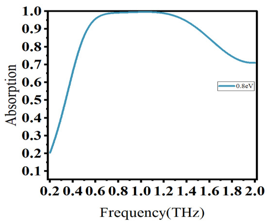 We used CST Microwave Studio 2019, commercial software for numerically simulating high-frequency electromagnetic fields. Specifically, we adopted the frequency domain solver module to set the structure with periodic boundary conditions in the x and y directions and open boundary conditions in the z direction. The incident wave was vertically incident from the upper surface of the absorber, and the entire computational field was discretized using a user-controlled tetrahedral grid. The Fermi energy of graphene is = 0.8 eV and the absorption characteristic curve can be observed in Figure 2.