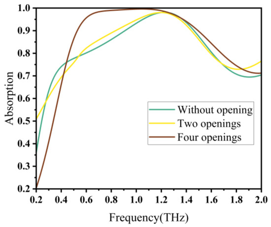 Furthermore, we investigated the number of openings in the ring structure, as shown in Figure 4. When the ring was not closed, the desired resonance failed to generate and perfect bandwidth absorption was not achieved. When the ring was opened twice, the equivalent impedance of absorber was not perfectly matched to the impedance of free space, resulting in a low absorption rate and a narrow bandwidth. However, when the ring was opened four times, the overall structure exhibited a high symmetry and the impedance was perfectly matched. The overall absorption rate and absorption bandwidth were optimal at this point.