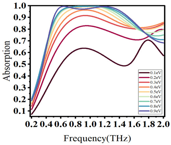To explore the dynamic tunable properties of the designed absorber, we changed the Fermi energy of graphene . The corresponding absorption characteristics are shown in Figure 5. As the Fermi energy increased, the resonance frequency exhibited a blue shift phenomenon and the resonance absorption peak gradually increased. This is because the increase in Fermi energy enhances the dielectric constant of graphene and consequently enhances the electromagnetic resonance effect of the absorber. However, when the Fermi energy exceeds 0.8 eV, the absorption peak tends to decrease. This implies that optimal absorption occurs at 0.8 eV. Dynamic tunability enhances the application potential of the absorber.