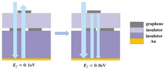 To better investigate the absorption mechanism of the proposed absorber, we also simulated the electric field distribution of incident waves. Figure 6 shows the electric field distribution of waves linearly polarized along the OY axis at the Fermi energy of 0.1 eV and 0.8 eV. To illustrate the electric field distribution clearly, we introduced the multiple interference theory for analysis. When the Fermi energy was 0.1 eV, the incident electromagnetic waves were reflected after reaching the metal bottom surface, with a portion resonating on the open ring graphene. This indicates that the absorption is not ideal at this point. When the Fermi energy increased to 0.8 eV, a significant amount of incident electromagnetic waves entered the absorber, eventually generating a resonant cavity within the structure. The electromagnetic waves repeatedly reflected in the resonant cavity and the interference between incident and reflected waves led to the absorption of waves. As a result, the perfect absorption of incident waves was achieved. The schematic diagram outlining this phenomenon is displayed in Figure 7.