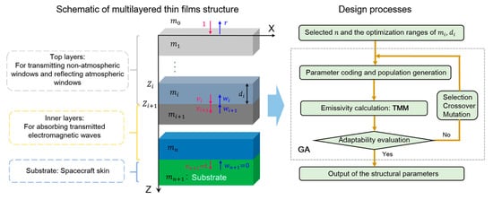 The schematic and design strategy of the multilayered thin films are illustrated in Figure 1. The structure is composed of n unit layers. The material and thickness of each layer are denoted as mi and di, respectively. In principle, they are expected to achieve the spectral selectivity by combining the unique electromagnetic response of each stacked layer: (1) the top layers allow transmission in the non-atmospheric window band but reflect in the atmospheric window band; (2) the inner layers absorb the transmitted electromagnetic waves in the non-atmospheric window band. In the design process, the transfer matrix method (TMM) and the GA are combined to determine the optimized layer number n, the material mi and the thickness di of each layer. Specifically, the GA is used for the structural parameters optimizing iterations, while the TMM is used to calculate the apparent emissivity in each iteration. The essentials of TMM and GA are presented below.