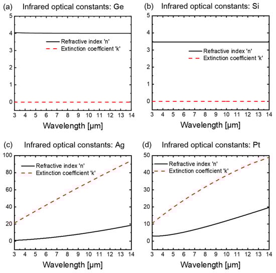 Infrared optical constants (n, k) of (a) Ge, (b) Si, (c) Ag, (d) Pt in the 3–14 μm range.
