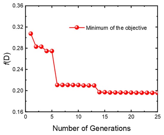 where β and β + 1 represent two adjacent generations. Eventually, the optimized results are obtained. In this study, the number of individuals in the random population is set to 40, and the maximum number of genetic generations is set to 25. The thickness range of each layer is set to 0.01–1 μm. Figure 3 illustrates the evolution of the objective function in the GA for one set of layered films. For all eight sets of structures, the GA achieves convergence within 25 generations.