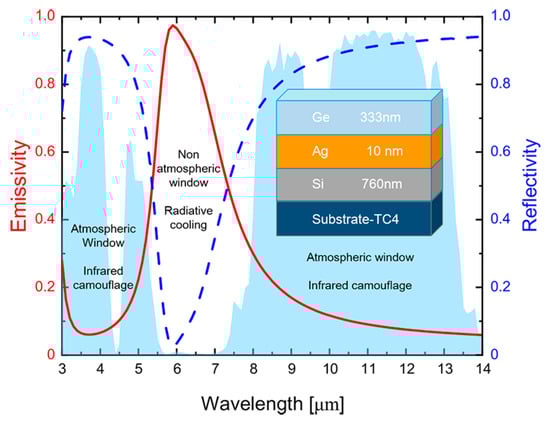 The final optimized structural parameters are shown in Table 2. The structure includes a Ge film layer, an ultra-thin Ag film layer, and a Si film layer with a thickness of 333 nm, 10 nm, and 760 nm, respectively. The three layers are stacked on the TC4 titanium alloy substrate. In order to evaluate the radiative properties of the structure optimized by the GA, we calculated the normal spectral emissivity and reflectivity, as shown in Figure 4. The shaded area in the figure is the transmittance of the atmospheric window. It is shown that the optimized structure has broad-spectrum low emissivity in the 3–5 μm and 8–14 μm atmospheric window bands as well as broad-spectrum high emissivity in the 5–8 μm non-atmospheric window band. We further calculated the average emissivity of these target bands as εavg,3–5 μm = 0.11, εavg,8–14 μm = 0.11, εavg,5–8 μm = 0.69, respectively. The results demonstrate that the optimized structure has desirable infrared camouflage and radiative cooling compatibility.