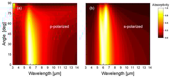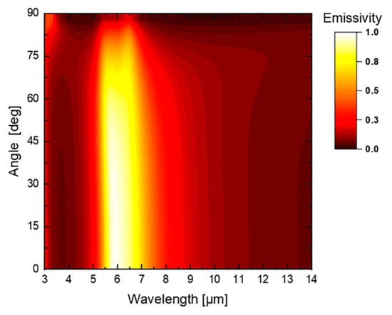 Emission direction and polarization characteristics are two more important factors in IR camouflage performance. Hence, we further examined the polarization and directional robustness of the optimized structure via the TMM. The spectral absorptivity of both p- and s- polarizations at different incidence angles are shown in Figure 5. It is shown that, for both p- and s- polarizations, the structure exhibits high absorptivity for non-atmospheric windows and low absorptivity for atmospheric windows over a wide angular range (0–80°). Since all of the thin films and the substrate are isotropic materials, according to Kirchhoff’s law, the emissivity of the optimized structure can be obtained by averaging the s- and p-polarized absorptivity, as shown in Figure 6. The results indicate that the infrared camouflage and radiative cooling compatibility of the coating is insensitive to direction and polarization.