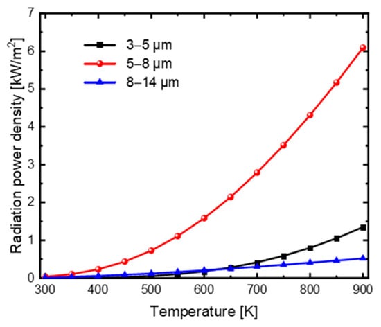 In order to access the radiative cooling performance and camouflage performance of the three-layered film structure, we calculated the emissive power density in 5–8 μm for radiative cooling and the IR radiation signal power density in 3–5 μm and 8–14 μm for being detected by Equation (11) [], respectively, where λ1 and λ2 are the minimum and maximum wavelengths of the integral spectra range, as shown in Figure 7. It can be observed that the radiative cooling power density increases significantly while the IR radiation signal power densities increase slightly with increasing temperature from 300 K to 900 K. Moreover, the remarkable increase of the radiative cooling power will contribute to the reduction of the spacecraft surface temperature, thus further suppressing the increase of the IR radiation signal intensity in the 3–5 μm and 8–14 μm detection bands. Consequently, the structure exhibits excellent compatible camouflage and radiative cooling performance, especially for high temperature spacecraft. In addition, the structure designed in this study achieves this compatibility with only three layers, which is simpler and more easily fabricated than those listed in Table 1.