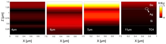 Figure 10 illustrates the spectral absorption distribution in the entire 3–14 μm band. It can be seen that the greatly enhanced absorption mainly focuses on the thin Ag layer in 6–8 μm, and a weaker absorption occurs in the TC4 substrate in 5–6 μm. The combination of the absorption by the Ag layer and the TC4 substrate leads to the apparent high emissivity of the optimized structure in the 5–8 μm non-atmosphere window for radiative cooling. Although the top Ge layer also absorbs within this band, the power absorption density is much lower than the Ag layer and the substrate. In addition, the absorption density in the 3–5 μm and 8–14 μm ranges is much lower than that in the 5–8 μm range, which is the reason for the low emissivity in the atmospheric window bands. Consequently, it is verified that the optimized structure realizes the IR camouflage and radiative cooling compatibility with the electromagnetic response combination of each layer. In this study, we used the open-source software S4 (version 1.1.1) [] to calculate the internal normalized electric field distribution and normalized absorption distribution in the optimized structure.