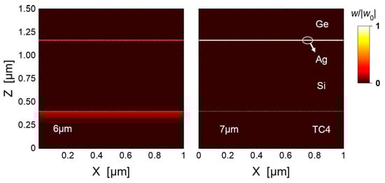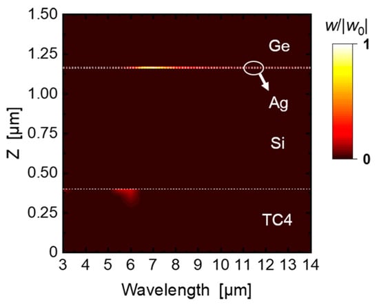 In order to clarify the mechanism of the spectrally selective emissivity, we examined the normalized electric field of the optimized structure at wavelengths of 4 μm and 11 μm in the atmospheric window and at wavelengths of 6 μm and 7 μm in the non-atmospheric window as examples, respectively, as shown in Figure 8. It can be seen that the electric field intensity of the structure at wavelengths of 4 μm and 11 μm are much lower than that at wavelengths of 6 μm and 7 μm, which indicates that the outer surface of the top Ge layer makes the first spectral selection. That is, the top Ge layer reflects off most of the electromagnetic waves in the atmospheric window bands (see 4 μm and 11 μm) but allows the electromagnetic waves in the non-atmospheric window band (see 6 μm and 7 μm) to penetrate into the interior of the stacked structure. Once the electromagnetic waves within the non-atmospheric window enter the interior of the structure, they are first attenuated during their passage through the top Ge layer, and subsequently the remaining waves propagate onto the ultra-thin Ag layer. The Ag layer plays a key role in two aspects. One aspect is that the thin Ag layer forms the Fabry-Perot (F-P) resonance [] together with the Si layer and the titanium alloy substrate. The F-P resonance localizes the electromagnetic waves in the cavity. The other aspect is that the thin Ag layer can efficiently absorb both the localized electromagnetic waves and the transmitted electromagnetic waves from the Ge layer. Figure 9 illustrates the absorption distribution of the optimized structure at 6 μm and 7 μm under normal incidence, where the power absorption density (W/m3) is defined as [,]: