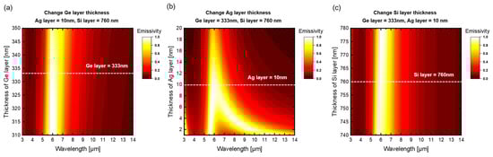 Sensitivity of the spectral emissivity to the thickness of each layer: (a) Ge layer, (b) Ag layer, (c) Si layer. The white dashed lines represent the desired thicknesses optimized by GA.
