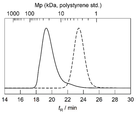 The 1H and 19F NMR spectra were measured using an AVANCE III HD spectrometer (500 MHz; Bruker Biospin K.K., Yokohama, Japan). The excitation spectra were measured using a spectrofluorometer (FP-6300, JASCO Co., Ltd. (Tokyo, Japan)). Preparative gel permeation chromatography (preparative GPC) was carried out using an LC-908 Recycling Preparative high-performance liquid chromatography system (Japan Analytical Industry Co., Tokyo, Japan) using two polystyrene gel columns (JAIGEL-2.5H and JAIGEL-2H) as the stationary phase and CHCl3 as the eluent. Size-exclusion chromatography (SEC) was performed using a high-performance liquid chromatography instrument (pump, LC-20AT; refractive index detector, RID-10A, Shimadzu Co.). Styragel HR4 (7.8 × 300 mm; Waters Co., Milford, MA, USA), Styragel HR3 (7.8 × 300 mm), and Styragel HR1 (7.8 × 300 mm) columns were used at 40 °C as the stationary phase. Tetrahydrofuran was used as the mobile phase at a flow rate of 1 mL min−1. The plots of log M vs. retention volume were prepared using 11 polystyrene standards (Showa Denko, K.K., Tokyo, Japan) ranging in molecular mass from 1.31 to 3740 kg mol−1. The number average molar mass (Mn) and dispersity (Mw/Mn) were calculated using polystyrene calibration. The size distribution measurement was performed with a Zetasizer Nano ZSP (ZEN5600, Malvern Instruments, Herrenberg, Germany) equipped with a He−Ne laser (λ = 633 nm).