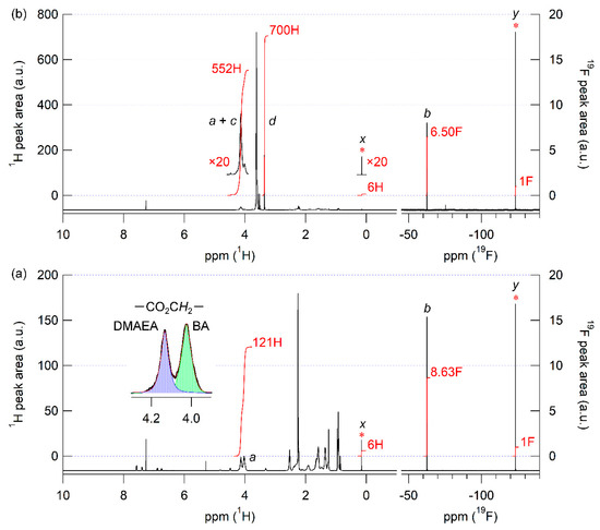 1H (right panel) and 19F NMR spectra (right panel) of P(BA-co-DMAEA) macroCTA (a) and P(BA-co-DMAEA)-b-PPEGA (b) with 4-fluorophenoxy-tert-butyldimethylsilane as a cross-reference in CDCl3. The peak assignments a, b, c, d, x, and y are presented in Scheme 1. Asterisks indicates the peaks attributable to the cross-reference. The inset of (a) is the expanded 1H NMR spectra ranged from 3.8 to 4.3 with the best-fitted curves.