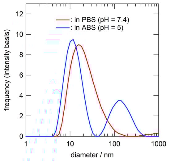 Polymer micelles were prepared via dialysis. Briefly, a DMF solution of P(BA-co-DMAEA)-b-PPEGA was dialyzed against phosphate-buffered saline (PBS) to obtain a clear, colorless solution. The polymer concentration was adjusted to 2000 mg L−1 with PBS. The critical micelle concentration (CMC) was evaluated via fluorophotometry using pyrene as a hydrophobic probe. Figure 3 shows the plots of the fluorescence intensity ratio (I338/I333) as a function of the logarithm of the polymer concentration. The crossing point of the two tangent lines gives a CMC value of 53 mg L−1. This value is comparable to that of P(St-co-DMAEA)-b-PPEGA (40 mg L−1) [29]. The size distributions of the polymer micelles were evaluated by dynamic light scattering (DLS) measurement, as shown in Figure 4. The hydrodynamic diameter, Dh, was estimated to be 18 nm. This value was comparable to that of P(St-co-DMAEA)-b-PPEGA [29]. The pH-responsive nature of the micelles was examined via DLS using polymer micelles prepared with ABS (pH 5) instead of PBS (pH 7.4). The blue line in Figure 4 shows the apparent size distribution of the polymer micelles in ABS. This significant change suggests the pH-responsive nature of the polymer micelles. It should be noted that the inverse Laplace transform of the autocorrelation function of the sample in ABS (blue line) is not so reliable for unstable aggregates. Similar results was reported by Bovone et al. in their DLS study on polymer micelles during solvent quality change [35].
