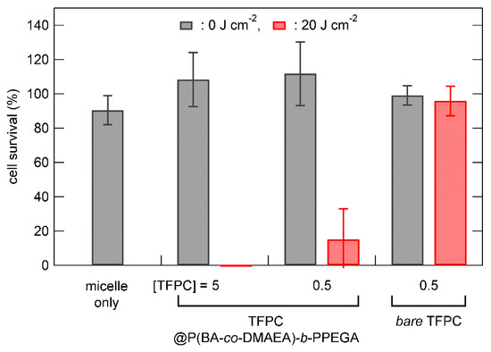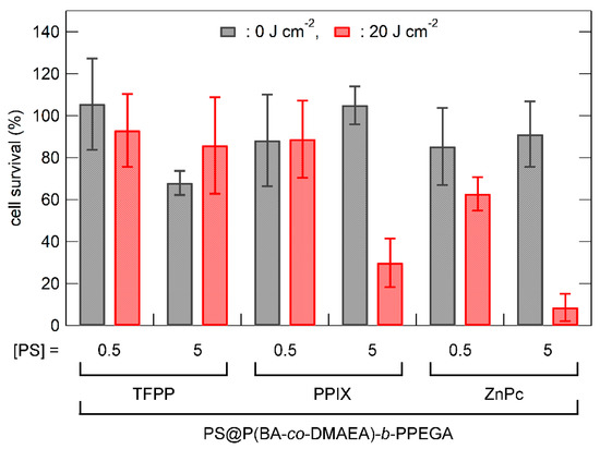 The photocytotoxicity of the photosensitizer-loaded polymer micelles was examined in RGK-1 cells. Empty polymer micelles showed no cytotoxicity at a polymer concentration of 1000 mg L−1 (Figure 5; micelles only). Figure 5 shows the dark and photocytotoxic effects of the TFPC-loaded polymer micelles and bare TFPC on RGK-1 cells. No cytotoxicity was observed without photoirradiation. Bare TFPC (without encapsulation in polymer micelles) showed no cytotoxicity with photoirradiation (λ > 500 nm; light dose, 20 J cm−2). In contrast, TFPC-loaded polymer micelles exhibited significant photocytotoxicity under the same TFPC concentration and photoirradiation conditions. Hence, P(BA-co-DAMEA)-b-PPEGA micelles act not only to solubilize hydrophobic photosensitizers but also to enhance photodynamic action. In order to elevate the PDT efficacy, the photosensitizers must have (1) efficient internalization into the cell, (2) no concentration quenching, and (3) localization in the vicinity of the target intracellular organelle or biomacromolecules. The encapsulation in polymer micelles is thought to enhance cellular internalization via the endocytotic pathway and to prevent the precipitation of photosensitizers and local concentration quenching. Figure 6 shows the photocytotoxicity of various photosensitizer-loaded polymer micelles in RGK-1 cells. In the case of TFPP, no significant photocytotoxicity was observed because of its high aggregation tendency and poor absorbing ability at wavelengths over 500 nm. PPIX-loaded polymer micelles exhibited detectable photocytotoxicity at the concentration of 5 μM with photoirradiation of 20 J cm−2. ZnPc-loaded polymer micelles showed higher photocytotoxicity than PPIX-loaded micelles, plausibly because of their higher absorption ability in extended wavelength regions. The PDT efficacy of ZnPc-loaded P(BA-co-DMAEA)-b-PPEGA micelles (approximately 60% survival ratio, 0.5 μM with 20 J cm−2 photoirradiation) was lower than that of P(St-co-DMAEA)-b-PPEGA (almost executed at 0.05 μM with 20 J cm−2 photoirradiation) [29]. These results suggest that the pH-responsive unit DMAEA, which acts as a PDT efficacy enhancing element, is not the only key factor in photosensitizer carriers. The pH-insensitive units, such as BA and St, also affect the PDT action through other factors, such as photosensitizer-solubilizing ability and significant incompatibility with the hydrophilic PPEGA segment to stabilize the core−corona microstructure.