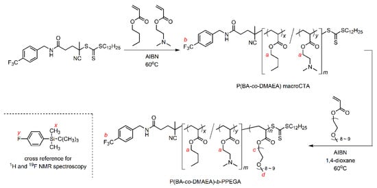 Synthesis of P(BA-co-DMAEA)-b-PPEGA via RAFT polymerization. The red letters are symbols for peak assignments in Figure 2.