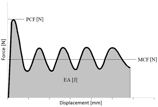 In order to correctly analyze the crush of passive energy absorbers over the years, indicators began to appear in scientific publications to determine the performance of thin-walled structures. Based on the graph of the force-shortening relationship (Figure 1) and the basic parameters recorded during crushing, such as the total shortening of the sample or the maximum force, it is possible to determine crush efficiency indicators. The first basic quantity needed is the energy absorbed during the crush, described by Equation (1); however, in scientific research to compare the geometric changes introduced, the comparison of models is performed with the same initial energy.
