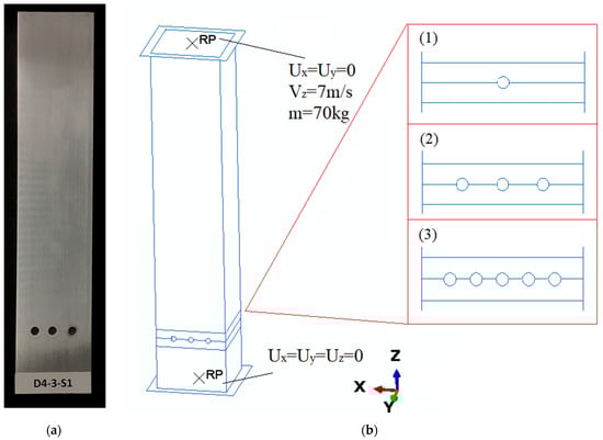 This study used the finite element method (Abaqus) as well as experimental models to verify the numerical one. The test specimen took the shape of a square column with a crush initiator in the form of drilled holes located at a height of 30 mm from the bottom edge of the absorber. The fixed parameters were a height of 200 mm, a cross-section of 40 × 40 mm, and a side wall thickness of 1.2 mm. The columns were made of AA-6063-T6 aluminum alloy, the model of which was determined by static tensile testing. The test specimens had an initiator in the form of one, three, or five holes, aligned as shown in Figure 2. In addition, the holes had a variable diameter in the range of 1 to 4 mm. All specimens were tested with the same initial conditions (i.e., a constant mechanical energy of 1700 J, which was the resultant mass of the 70 kg beater and its velocity of 7 m/s).