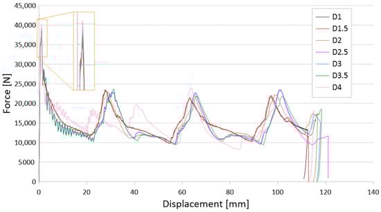 The first group of analyzed cases was a passive absorber with one axially located crush initiation hole. The hole was located 30 mm from the edge of the column base and was on two opposite walls. Figure 4 shows the force-shortening characteristics for one initiation hole of different diameters. Because the weakening of the structure due to the discontinuity of the column wall was too small, the results with one hole did not cause a significant change in the characteristics. The occurrence of force peaks was similar for all curves in Figure 4. The case that stands out is the column with a single hole with a diameter of 4 mm. Despite the small difference between the tested hole diameters, the impact is evident compared to the smooth column without an initiator.