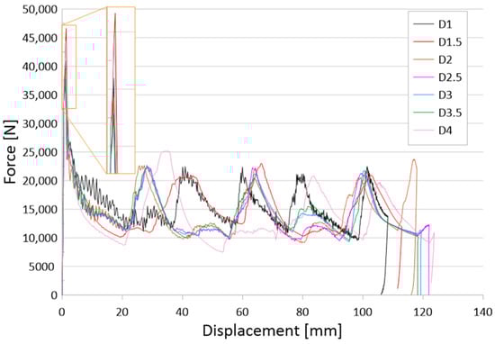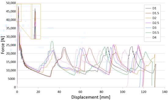 The numerical tests carried out made it possible to present the values of force as a function of displacement, which is the basic graph for the subsequent determination of crush efficiency indicators more extensively described in Section 2. During the analysis, 1000 measurement points were obtained, which made it possible to determine the indicators with a high degree of accuracy.