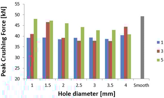 The last group of tested initiators consisted of five holes placed in a row according to Figure 2b. The plots of the force as a function of shortening presented in Figure 6 show the greatest differences depending on the diameter of the holes used. The PCF values ranged from 42 to 47 kN, and the effect of diameter is much more visible than with one or three holes of the same diameter (Figure 4 and Figure 5). For the models with 1 mm and 1.5 mm diameter initiators, similar behavior to that of the three-hole initiators is noticeable. The samples generated the largest initial force peak as seen in Figure 6. The consequence of a large overload was a significant decrease in force and low efficiency of the first fold. The force peaks occurring later were offset from the others in terms of the force-shortening characteristic. All samples were loaded with a constant energy of 1,700 J; however, the sample with the smallest hole diameter, absorbing energy along the largest path. This would indicate a relatively low mean crushing force (MCF) and low crushing force efficiency (CLE). In order to correctly analyze the discussed trigger cases, it was necessary to compare the results for different diameters. The selected crush efficiency indicators are presented in the form of column charts (Figure 7 and Figure 8).